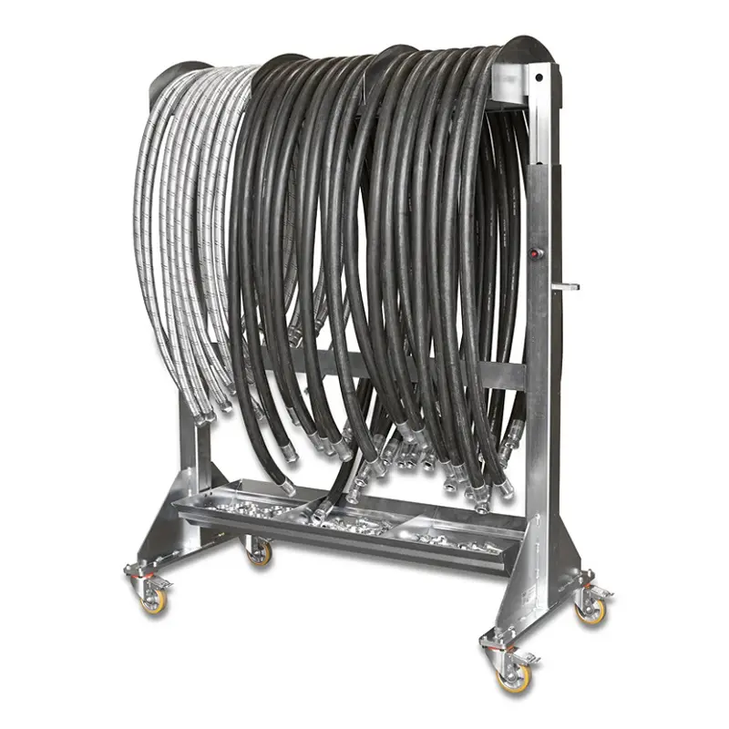 Practical, sturdy and equipped with wheels that make it easy to move it around your workshop, this hose carrier is the ideal support for your hose assembly department. Designed to carry a large amount of flexible hoses of considerable weight and dimensions, it’s the perfect solution to organize your work.Product specifications could be modified without prior notice.