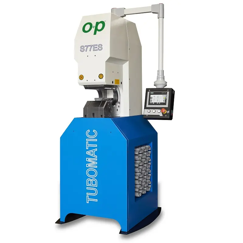 The crimper Tubomatic S77ES was specifically designed to crimp hoses having tight and complex bends. In fact, it is provided with a frontal rift which facilitates hose passage, increasing productivity. This peculiarity becomes especially useful in the automotive industry, where the combined use of flexible hoses and rigid tubes is becoming more and more common.